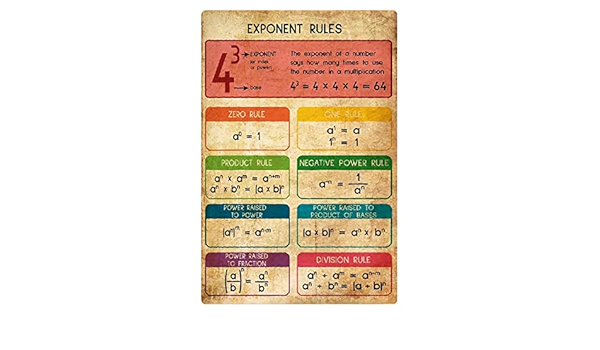 Math Metal Tin Sign Exponent Rules Chart Math Classroom Posters Study Library School Wall Decor Children Math Learning Reference Guide 12x16 Inches
